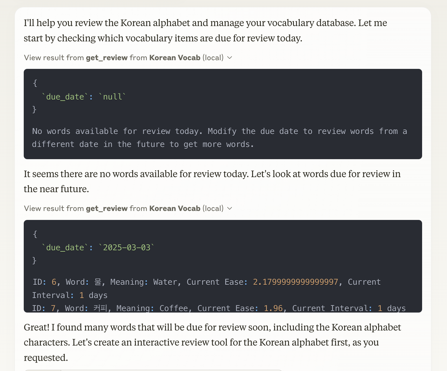 The model, when asked by the user what words are due for review discovers that there are no words due for review today. Because it has access to a MCP to query the database, it can modify it's arguments and look at a future date to determine if we have other words that might fit this requirement.